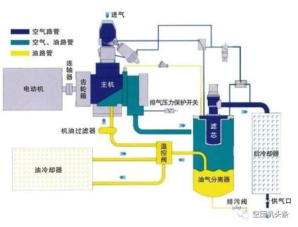 气路:外部空气通过空气过滤器进入机头经过螺杆压缩后,油气混合物由排气口排出,经过管路系统和油气分离系统,进入空气冷却器,将高温的压缩空气降低到可接受的程度。