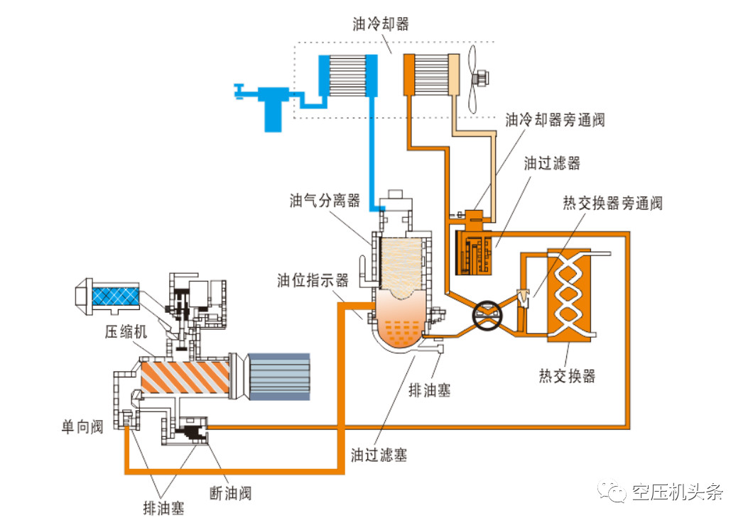 油路:油气混合物由主机出口排出,在油气分离筒体内冷却油与压缩空气分离后进入油冷却器,将高温油的热量带走,冷却后的油经过相应的油路重新喷入主机,进行冷却、密封和润滑。如此反复。