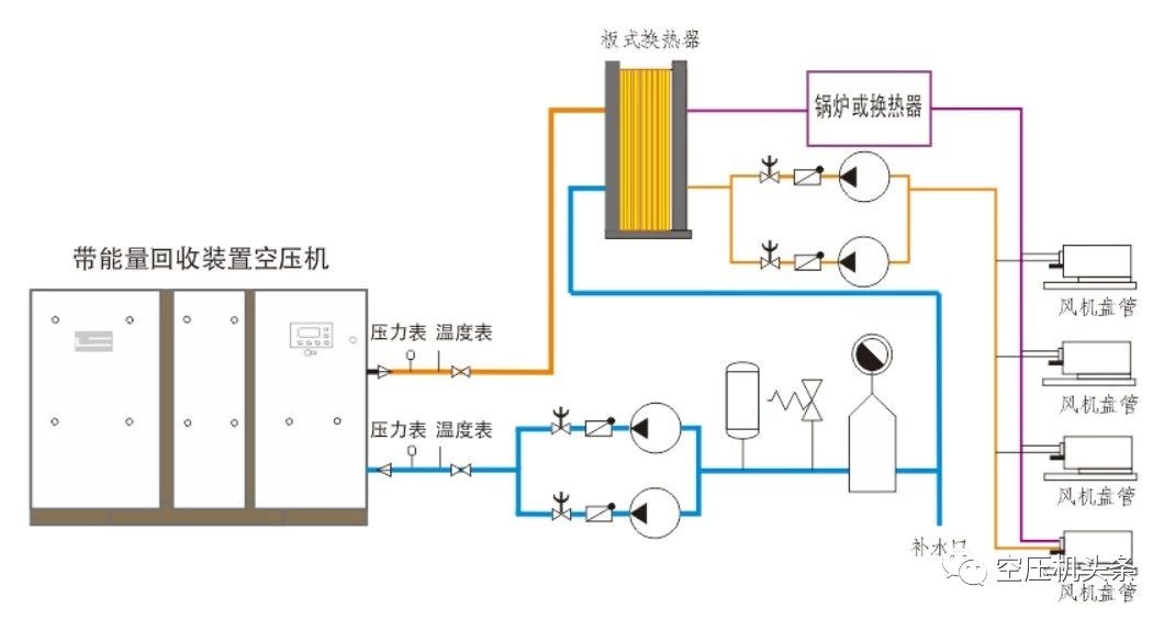 喷油螺杆空压机的余热回收系统形式较多,下面列举两种最常见的系统。